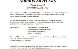 2019-2020 m. – Kursai „Maitland manualinė terapija“ 1-lygis. (160 val.), lekt. OMPT DVMT, MSc. Sandra Baumgartner (Austrija,Vokietija)