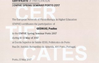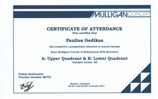 2017 m. – Kursai “Mulligan manualinės terapija Viršutinis ir apatinis kvadrantas“ (32 val.), lekt. Vaidas Stalioraitis (Australija),