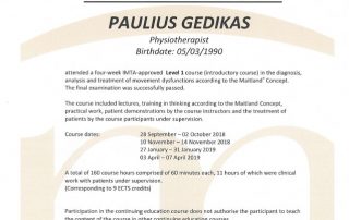 2018-2019 m. – Kursai „Maitland manualinė terapija“ 1-lygis. (160 val.), lekt. OMPT DVMT, MSc. Sandra Baumgartner (Vokietija)