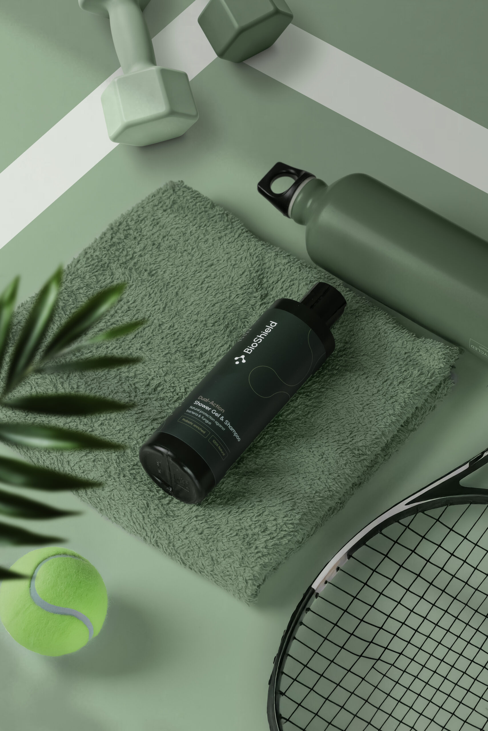 Pirmasis BioShield produktas – funkcinei sporto higienai skirtas dvigubo poveikio dušo želė ir šampūnas. Apsaugokite savo odą nuo bakterijų ir grybelių patogenų kasdien. Probiotikais praturtinta formulė stiprina odos apsauginį barjerą, palaiko natūralią jos pusiausvyrą.