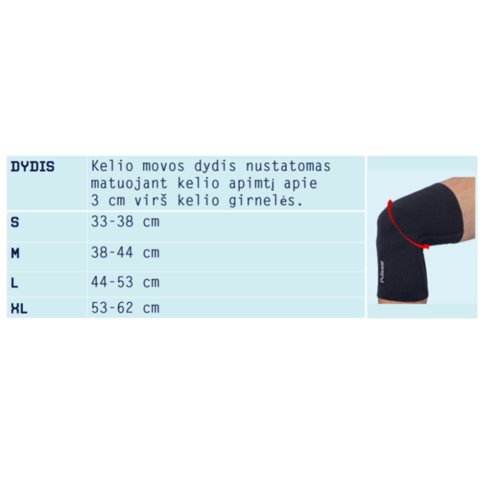 Medicinos priemonė I klasė. Sudėtis: 22 % poliesteris (su bambukų anglimi), 20 % medvilnė, 17 % poliesteris (su germaniu), 17 % nailonas, 12 % poliesteris, 12 % elastanas. PULSAAR ACTIVE kelio mova yra siūloma 4 dydžių ir 1 spalvos (juodos).