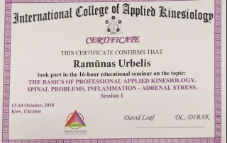 - 2018 m. – Seminaras „The Basics of Professional Applied Kinesiology. Spinal Problems. Inflammation – Adrenal Stress. Session 1“ (16 val.), lekt. David Leaf (JAV)