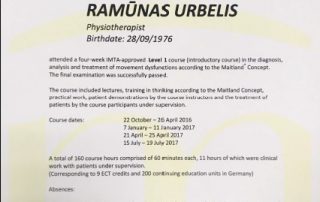 - 2017 m. – Kursai „Maitland manualinė terapija“ 1 lygis (160 val.), lekt. Birgit Ferber-Busse (Vokietija)