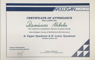 - 2014 m. – Kursai „Mulligan manualinė terapija Viršutinis ir apatinis kvadrantas“ (30 val.), lekt. Vaidas Stalioraitis (Australija)